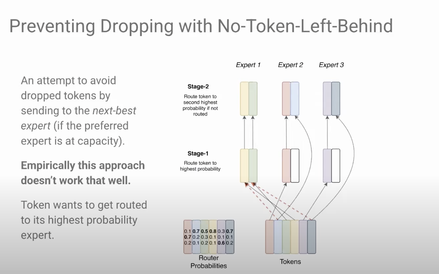 저자들은 Expert dropout을 위해, 토큰이 drop 되거나 계산이 적용되지 않은 토큰이 있으면 모델 성능이 저하될 수 있다고 생각해 multiple step routing 프로시저를 수행해 먼저 각 토큰을 가장 높은 확률 expert에게 보낸 후 drop된 토큰을 두 번째로 높은 확률을 가진 expert에게 보내는 식으로 프로세스를 반복해 토큰이 drop되지 않도록 보장하도록 실험을 해보았다고 한다. 하지만 흥미롭게도 실제 이 방식은 모델 성능을 empirically 향상시키지 못했다고 한다. 실험을 하는 도중에 놀라웠던 점은 token dropping이 굉장히 견고해서 dropout 비율을 크게 늘려도 성능이 향상되었다고 한다. dropped 토큰은 하나의 expert에게만 좋고 다른 expert로 rerouting할 필요가 없었다고 한다.