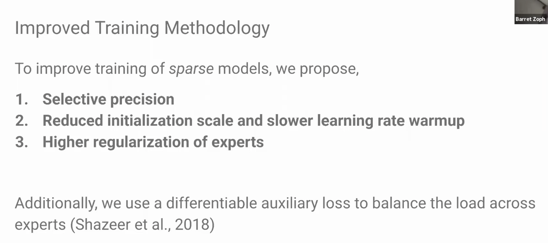 토큰을 여러 개의 expert에 보내는 것은 communication cost가 증가할 수 있어, 한 expert에게만 전송해 알고리즘을 단순화시킬 수 있다. sparse model을 학습하기 위해 저자들은 위 3가지에 중점을 두었다. 첫 번째는, Selective precision으로 sparse model을 낮은 정밀도 형식으로 훈련할 수 있게 하는 것이다. sparse model에서는 특히 데이터의 스케일이 커지거나 작아지는 간격이 dense model보다 클 것이다. 그럴 경우 loss 계산에서 exponential하게 커지기 때문에 학습이 더 불안정해 질 수 있으며 특히 라우터의 softmax 연산시 상황을 더 악화시킬 수 있다. 따라서 selective-precision을 사용해 비슷한 결과를 더 빠르게 학습할 수 있었다고 한다. 두 번째는, 텐서 계산을 float32 타입을 사용할 경우 속도가 느리기 때문에 몇 가지 initialize trick과 learning rate schedule 등을 통해 모델의 크기가 커져도 안정적으로 학습할 수 있도록 한다. 예를 들어 fine-tuning하는 동안 extra expert dropout을 크게 늘리면 성능이 크게 향상되었다고 한다.