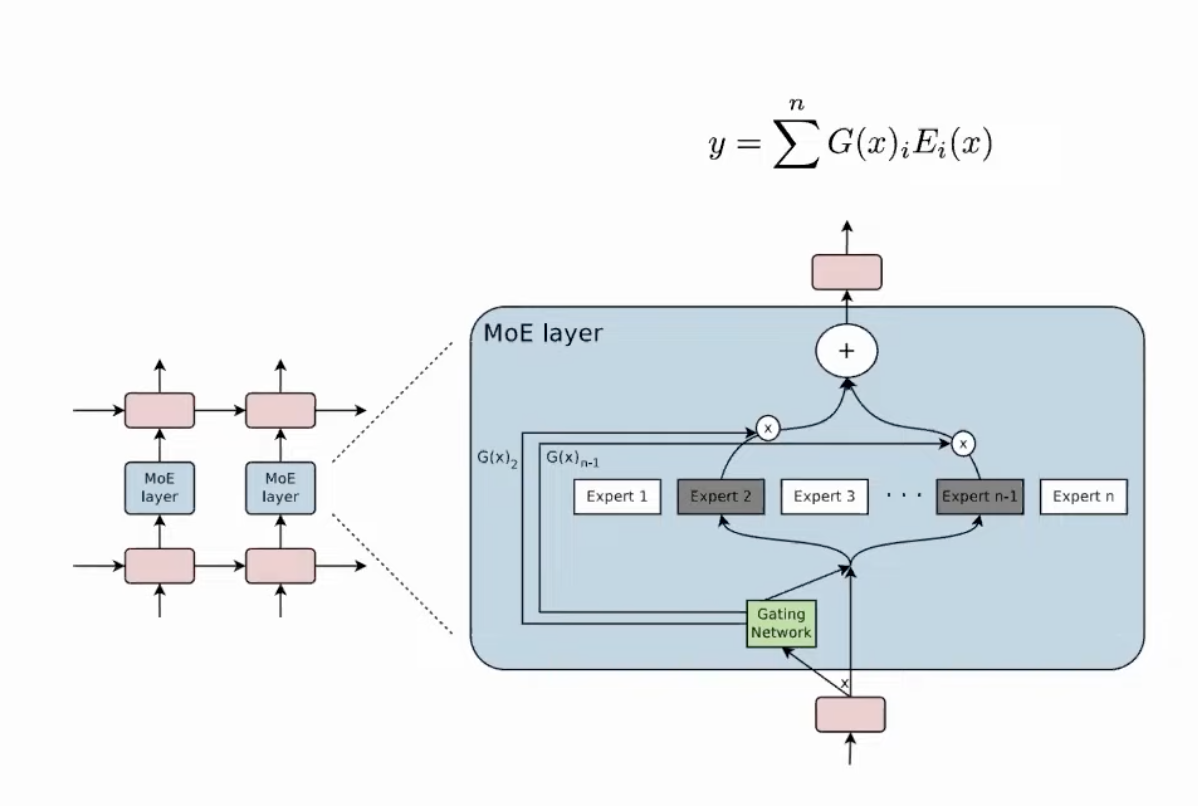 기본적으로 우리가 네트워크를 학습할 때, 입력에 따라 sparsely activated weight가 있을 것이다. 모든 입력은 대략 비슷한 양으로 계산되지만 다른 가중치가 적용된다. 이는 1991년에 제안된 Mixtures of local experts라는 논문에서 착안한 것이고 최근 구글 브레인에서 LSTM에 여러개의 피드포워드 네트워크로 구성하고 각 네트워크를 일종의 expert로 보고 그 네트워크를 모아 mixture of experts로 구성하였다. gating network에서 각 토큰의 expert probabilty(E_i(x))를 출력하고 이 분포는 softmax결과((G(x)_i), i expert의 가중치)가 곱해져 계산된다. 여기서 몇 명(몇개)의 expert(network)를 선택하게 되는데 선택할 때 다양한 전략이 있고(이후 언급할 예정) 출력은 단순히 선택한 모든 expert의 가중치 혼합물이다. 즉 위 그림의 맨 위 수식에서 볼 수 있듯 최종 결과는 expert network에서 생성되는 모든 결과의 weighted sum이 된다.