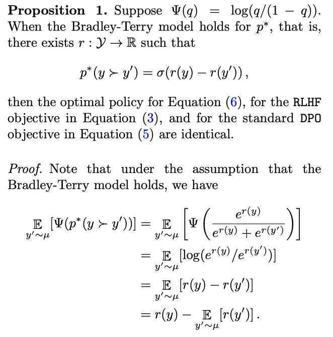 그리고 DPO 논문에서는 이 reward equation (3)이 어떻게 DPO와 같은지를 보이고 있으므로 DPO (5) 와도 같다고 할 수 있다.