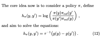위에서 살펴본 DPO의 overfitting 문제는 explicit reward function을 학습하지 않는 것과, unbounded Psi function의 combination에 기인한다. 그래서 Psi function이 bounded 되는 함수로 설정하고, 0-1 사이의 선호도 값을 가지는 데이터셋 이라고 하더라도 KL 텀의 효과가 남아있도록 하면 이를 막을 수 있다는 아이디어가 해당 논문이 제안하는 알고리즘이다. Psi를 Identity 매핑으로 취해 total preference의 직접 regularized optimization으로 이어짐으로써 제공된다.