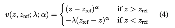 Value function v: z -> R은 어떤 z_ref에 상대적인 결과 z를 perceived(or subjective) value에 매핑한다. 예를 들어 이 함수는 사람이 같은 크기의 상대적 이득보다 상대적 손실에 더 민감하게 반응하는 경향이 있다는 사실을 포착한다.