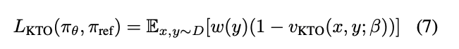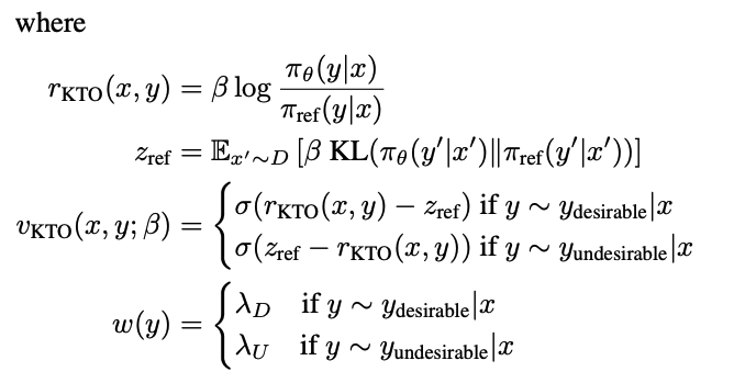 보다 원칙적인 접근 방식으로 저자들은 Kahneman-Tversky model of human utility를 사용한 HALO를 유도하고, 이는 선호 log-likelihood를 최대화하는 것 대신 직접적으로 utility(human feedback기반 보상)를 최적화 한다. 이 Kahneman-Tversky Optimization (KTO) loss는 오직 desired/undesired 두 시그널만 필요하므로 현실세계에서 더 수집하기 쉽다.