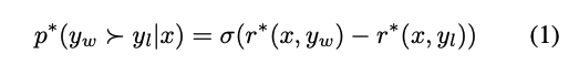 데이터셋에 인풋 x 그리고 두 아웃풋 y_w, y_l이 있을 때 각각 선호하는 답변, 선호하지 않는 답변이 있다. 여기서 선호에대한 r*는 true reward function이다. 이는 y_w이 y_l보다 선호된다는 것을 specific function class, 일반적으로 bradley-terry model, 가 포착한 확률이다.