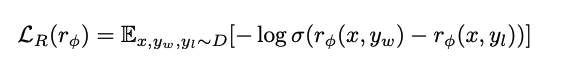 사람의 true reward는 얻기 어려우므로 rewrd model r_phi는 proxy learning을 하게 되는데, human preference data의 negative log-likelihood를 minimizing하는 방향으로 학습한다.