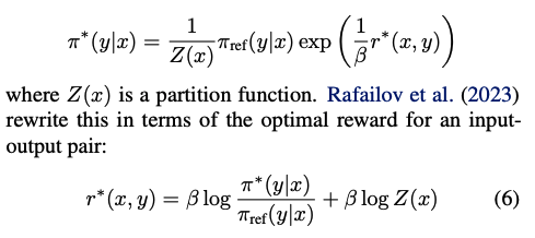 DPO에서 RLHF와 equivalence를 갖는 유도를 통해 optimal policy pi*와 true reward r*는 위와 같이 유도되었다. (https://ebbnflow.tistory.com/382)