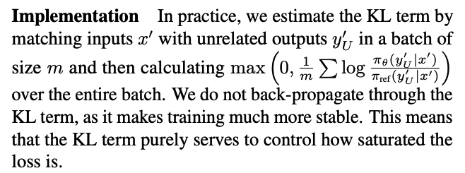 실제로 KTO는 KL term을 estimate하여 사용하고, back-propagate에 사용하지 않고 보상을 조절하는데만 사용되서 학습을 stable하게 만든다. 즉 KL 텀은 순전히 loss가 staturate (어느 정도 범위에서 수렴) 정도를 조정하는 역할만 한다고 볼 수 있다.