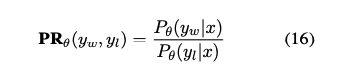 단순 확률 ratio(PR)을 사용하지 않고 odds ratio(OR)를 사용한 이유는 odds ratio의 안정성 때문이라고 한다. PR에 비해 OR은 선호하지 않는 응답에 대해 더 극단적으로 차별할 수 있는 효과를 줄 수 있다. OR은 PR에 (1-P(y_l))/(1-P(y_w))이 곱해진 값이므로 y_w과 y_l의 확률 차가 더 크다면 더 큰 값을 가지기 때문이다.