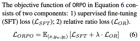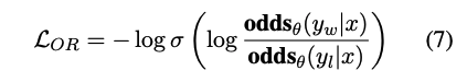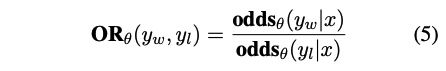 그리고 chosen 응답 y_w와 rejected 응답 y_l에 대한 odds의 비율은 OR로 정의하며 위와 같다. 이는 모델이 y_l보다 y_w를 생성할 가능성이 있는지를 나타낸다.