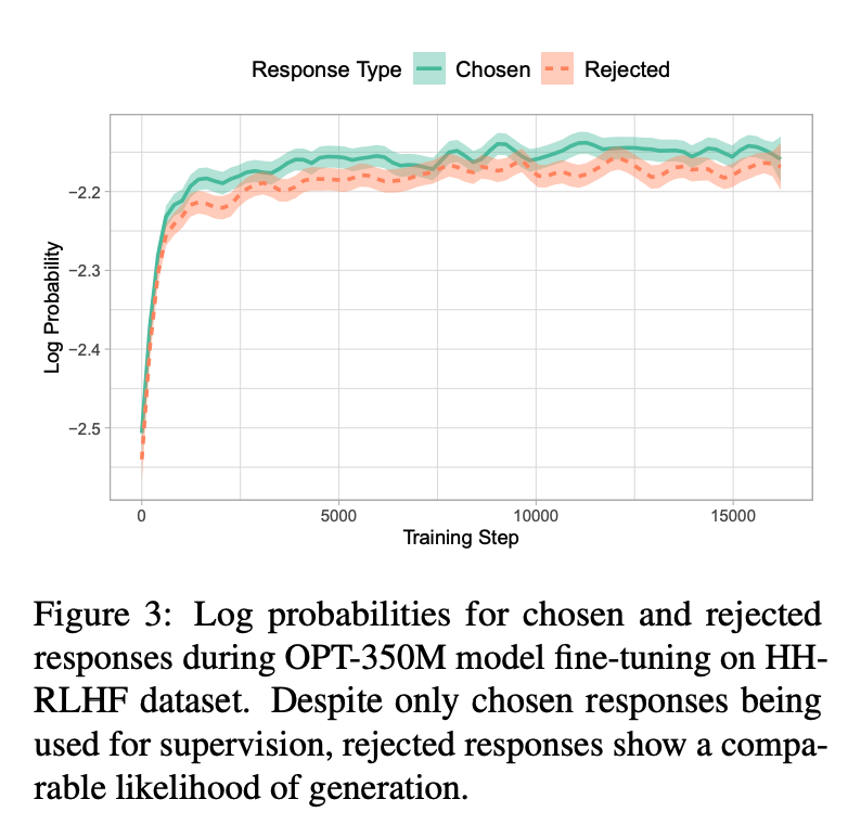 저자들은 SFT단독으로는 선호, 비선호 응답에 대한 잘못 조정할 수 있다는 것을 실험적으로 보였다. OPT-350M 모델에 HH-RLHF 데이터셋에서 선호된 답변만을 가지고 fine-tuning하였을 때 figure 3과 같이 선호 비선호 확률 모두 증가되는 것을 확인할 수 있었다고 한다.