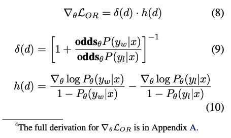 선호하는 응답의 확률이 비선호 응답보다 상대적으로 높을 경우 eq (9)는 0으로 수렴된다. 이는 L_OR의 gradient의 앞 텀(9)이 패널티 항의 역할을 하고 만약 모델이 rejected response를 생성할 확률이 더 높다면 parameter 업데이트를 가속화하는 것을 나타낸다.