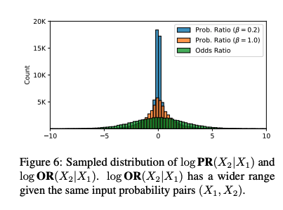 PR과 OR에 log sigmoid가 적용된다는 점에서 각 ratio의 스케일은 선호/비선호 likelihood 사이 예상 마진을 결정한다. 그런 의미에서 log simoid loss를 최소화하기 위해서는 PR을 사용할 때 더 극단적으로 차이가 나야 한다. 따라서 PR을 사용하게 된다면 모델은 더 과도하게 비선호 응답에 대한 로짓을 줄이게 되고, 비선호 응답을 너무 억제한다면 domain adaptation 능력을 잃어버릴 우려가 있다.