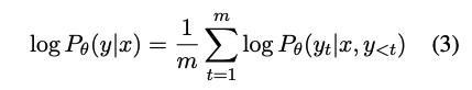 입력 시퀀스 x에 대해 길이가 m인 출력 시퀀스 y를 생성하는 평균 log likelihood가 있을때,