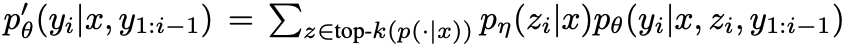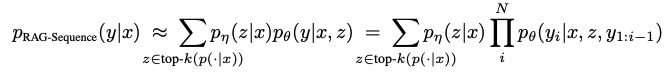 : 원래 인풋 $x$와 검색된 구(retrieved passage) $z$, 이전까지 생성된 토큰 $y_{1:i-1}$이 주어졌을 때 현재 토큰을 생성함