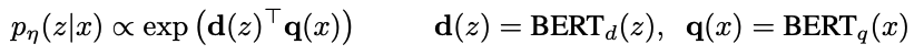 BERT_d는 메모리에 저장된 documents z를 입력으로 받고 BERT_q는 쿼리 텍스트 x를 입력으로 받아 각각 d-dimensional 실수 벡터를 생성한다. 그리고 검색기는 exp dot product로 이 둘의 유사도를 가지고 쿼리와 관련있는 텍스트 구를 검색하게 된다.