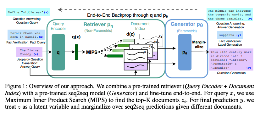 이를 위해 해당 논문에서는 prametric-menory generation models와 non-parametric memory를 사용해 일반적인 목적에 맞는 파인 튜닝 기법을 소개한다. end-to-end로 학습된 확률 모델에서 이러한 컴포넌트들을 결합한다.(아래의 figure 1) Dense passage retriever는 입력에 대해 조건화된 latent document를 제공하고 seq2seq 모델은 입력과 함께 이러한 latent document에 대한 조건을 지정하여 출력을 생성한다. per-output basis (동일한 문서가 모든 토큰을 담당) 또는 per-token basis (다른 문서가 서로 다른 토큰을 담당) 로 top-k approximation을 통해 latent document를 marginalize한다.