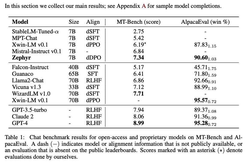 이를 검증하기 위한 실험은 Mistral-7B를 사용하여 학습하고 align된 모델은 ZEPHYR-7B라고 한다. 먼저 UltraChat 데이터를 기반으로 dSFT를 사용하고, UltraFeedback 데이터에서 수집된 AI Feedback을 사용한다. 마지막으로 이 피드백을 기반으로 dDPO를 적용한다. 실험에 따르면 7B 모델은 사람의 피드백에 맞춰 조정된 70B 모델과 비슷한 성능을 달성할 수 있다. 이 실험은 standard academic benchmarks 뿐 아니라 conversational capabilities 또한 향상된다는 것을 보여준다. 그리고 preference learning이 이러한 결과를 달성하는데 중요하다는 것을 보여준다.