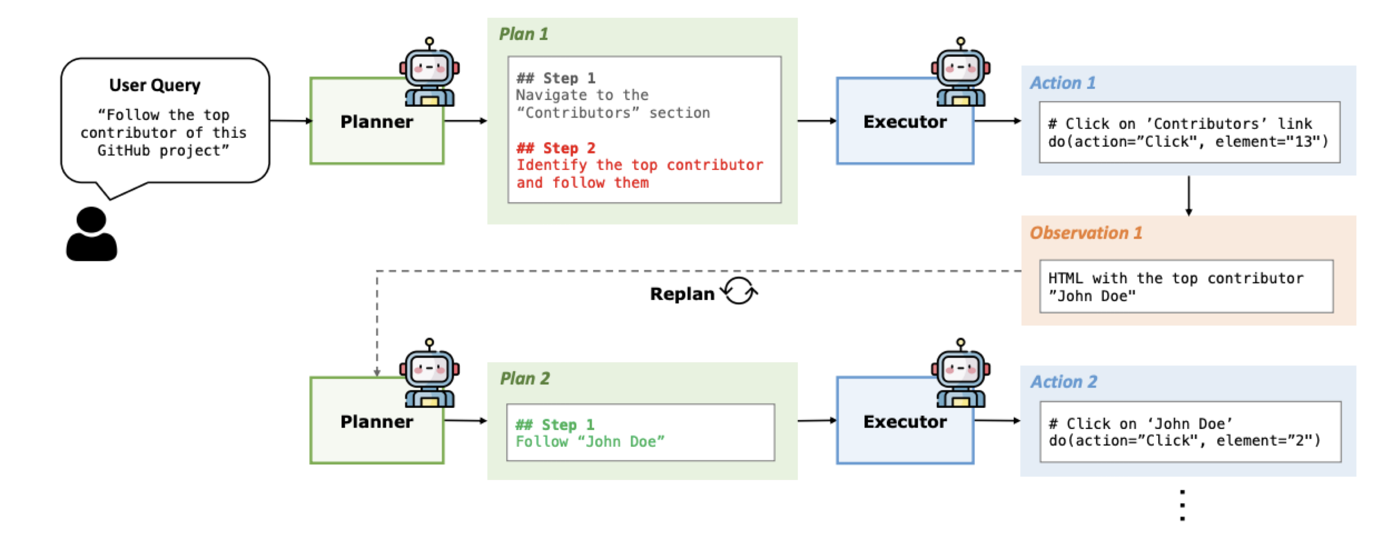 - Executor: 각 계획 단계에 따라 HTML 상태를 받아 구체적인 행동(action)을 수행