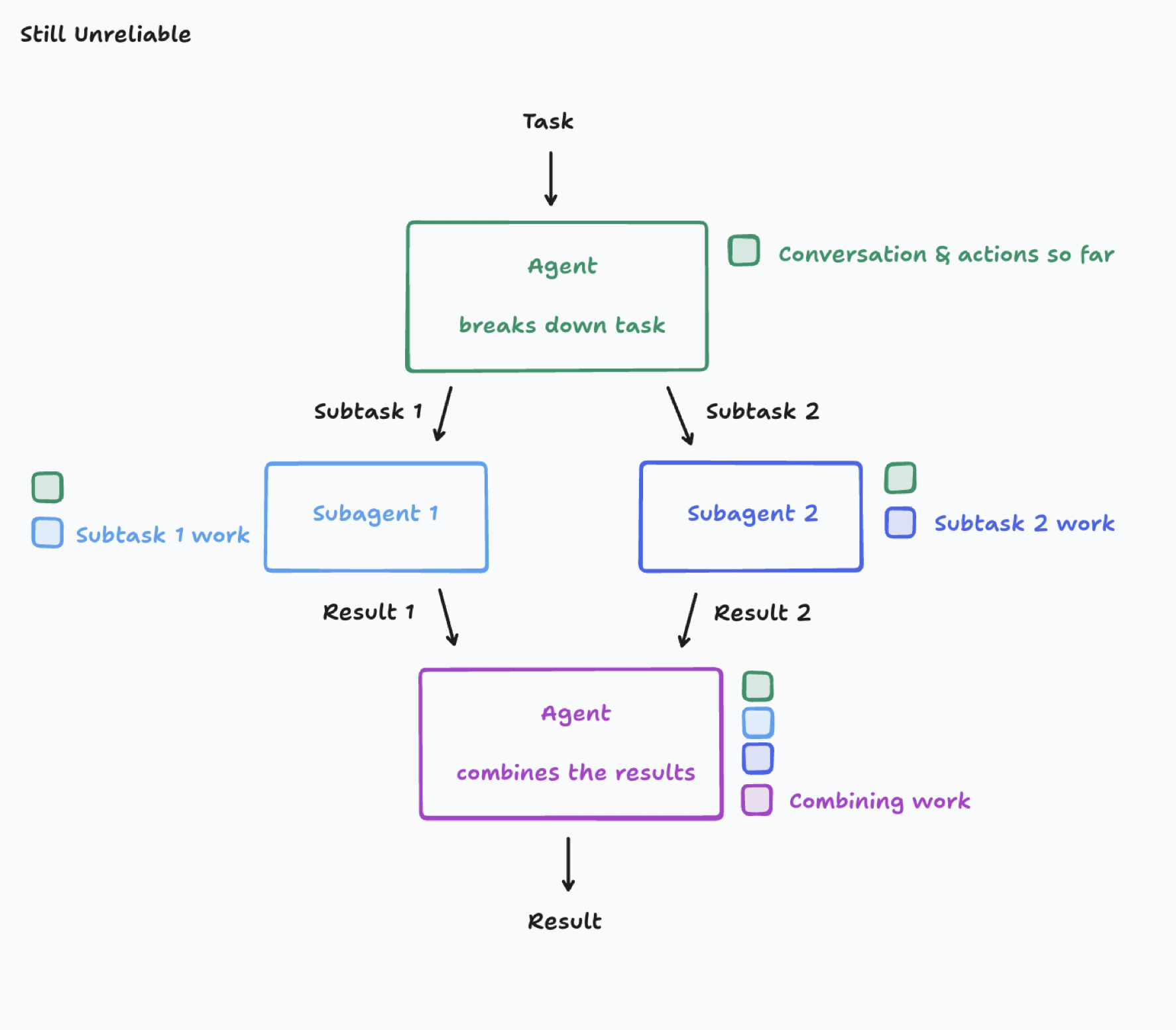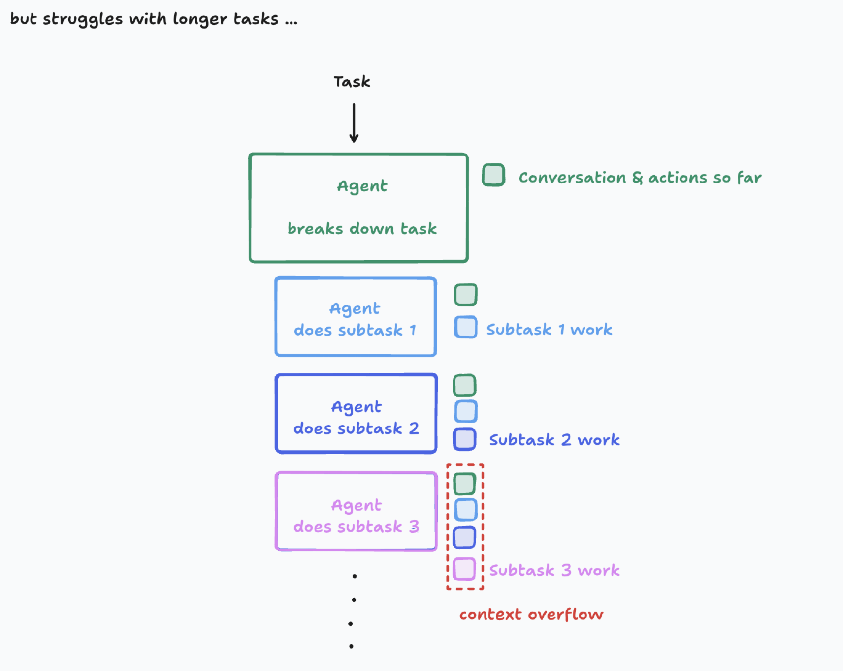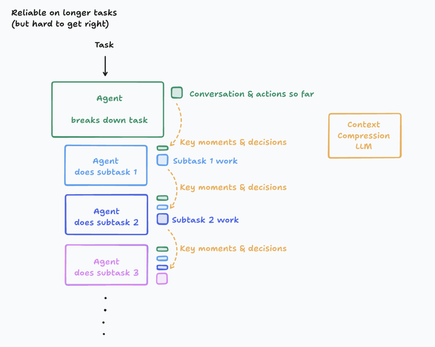 그러면 오른쪽 그림처럼 이전 대화나 여러 작업에 대한 기록을 요약하여 하위 에이전트에게 전달하는 방법이 있다. 이는 Context overflow 문제를 해결하면서도 동시에 일정 수준의 병렬처리도 가능할 수 있다. 하지만 결정적으로 어려운 점은 무엇이 중요한 정보이며 이를 어떻게 정의할 것인가에 대한 문제와 요약 자체의 품질 문제가 여전히 존재한다.