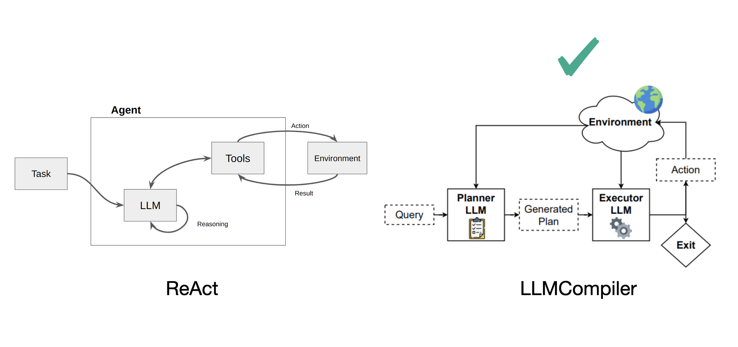 먼저 ReAct 기반 방법들은 사용자의 쿼리를 일련의 action으로 매핑하는 단일 모델 방식이며, LLMCompiler기반은 Planner와 Executor가 나누어져 있다. plan-and-act는 LLMCompiler 구조를 채택한다.
