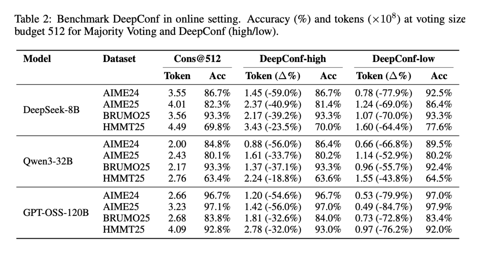 - DeepConf는 대부분의 모델·데이터셋에서 기존 다수결과 동등 또는 더 높은 정확도 를 보이면서,