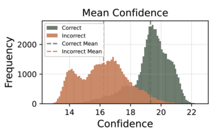 그리고 평균 경로 신뢰도(Average Trace Confidence, $C_{avg}$는 하나의 추론 경로(trace) 전체 토큰 $i=1...N$에 대해 $C_i$를 평균낸 값으로 수식(3)과 같이 나타낼 수 있다. 이는 전체 경로에 대한 평균 Confidence 즉 Global Confidence 를 의미한다. 위의 Mean Confidence 그림과 같이 이 값이 정답을 도출한 경우와 그렇지 않은 경우 유의미한 차이를 보인다고 하였다. 더 높은 평균 confidence를 가진 경로들이 대체로 정답일 가능성이 높으니 이 값은 trace 품질 측정의 척도로 사용하기 적합하다는 것이다.