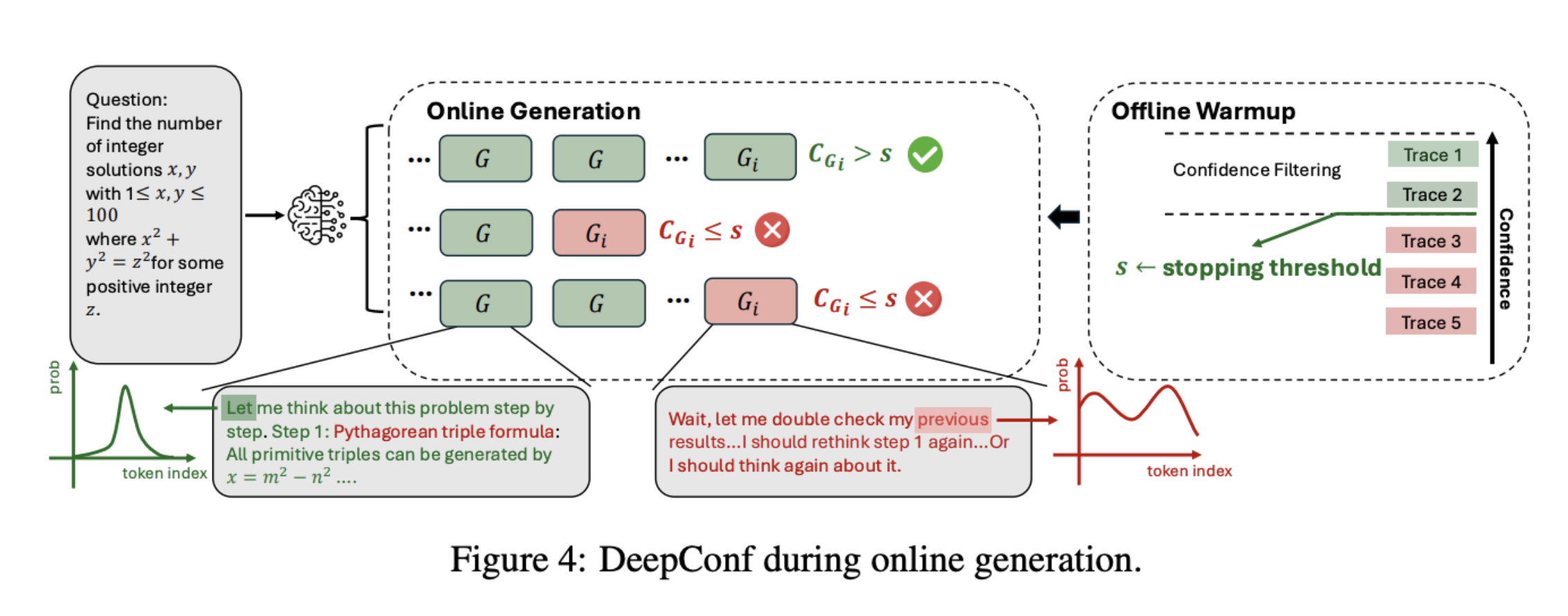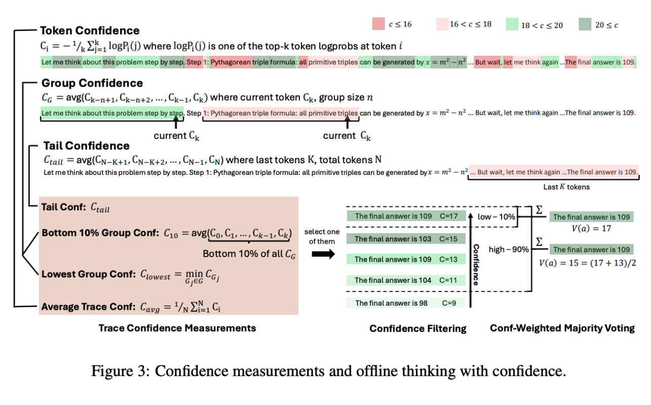2. 실시간 신뢰도를 계산한다. 각 단계에서 모델의 내부 확률분포를 이용해 Group Confidence 같은 신호를 계산한다. 구체적으로는 일정 길이의 토큰 윈도우(window)를 잡고, 해당 구간의 평균 토큰 신뢰도 $C_{G_i}$ 또는 최저 그룹 신뢰도 $C_{least}$ 등을 측정한다.