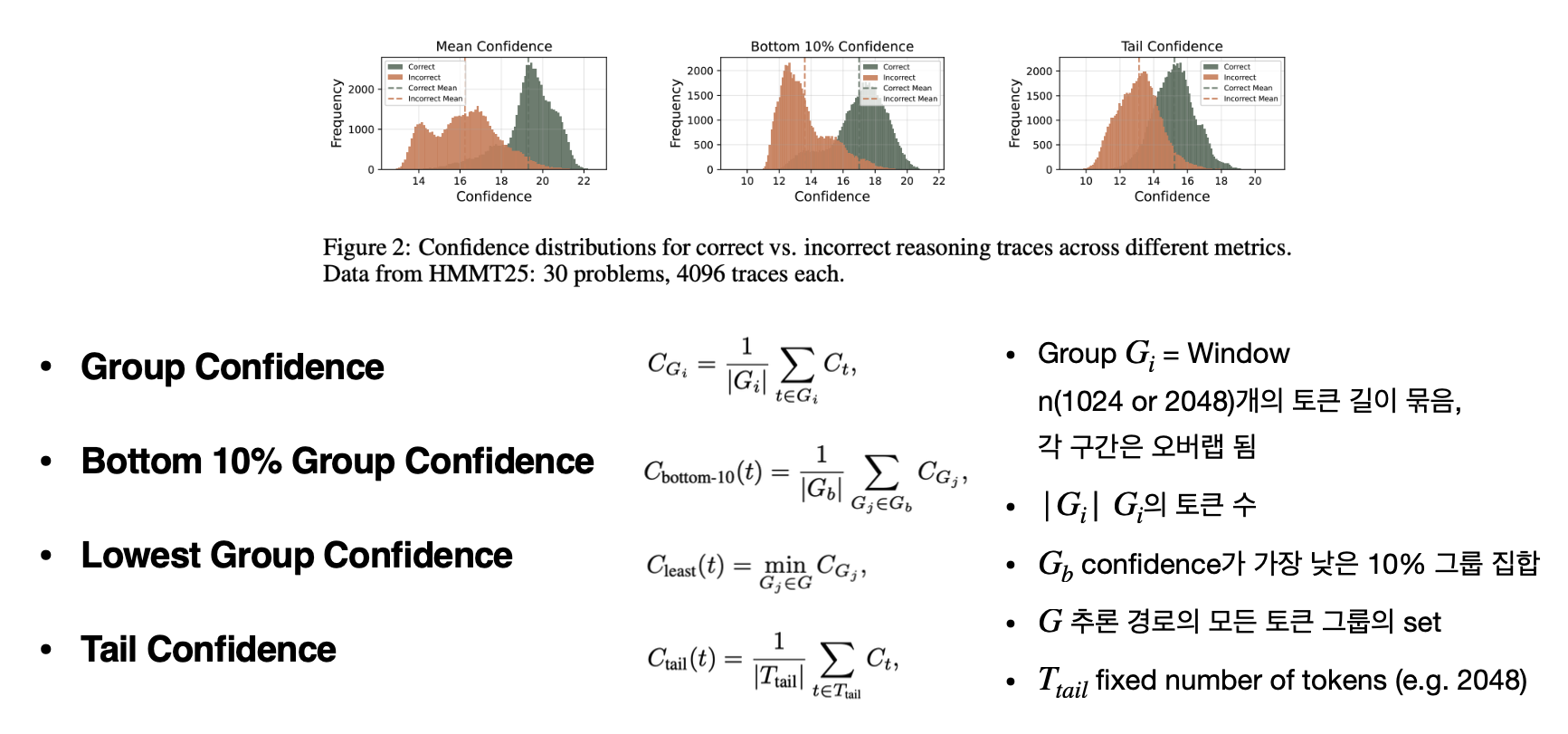그리고 꼬리 신뢰도(Tail Confidence, $C_{tail}$)는 경로의 마지막 일정 토큰 수(e.g. 마지막 2048 토큰)만 골라 평균 신뢰도를 보는 방식이다. 추론의 마지막 부분(tail) 은 정답의 정확도에 큰 영향을 미친다. 특히 수학적 추론에서 결론부는 해답을 확정하는 단계이므로, 초반에는 논리적이었더라도 끝에서 흐트러지면 전체 답이 틀릴 수 있다. 이를 포착하기 위해, reasoning trace의 마지막 일정 길이(예: 2048 토큰) 구간만의 평균 confidence를 계산한다: 즉, reasoning의 “마무리 구간에서 모델이 얼마나 확신에 차 있었는가”를 평가하는 지표다.