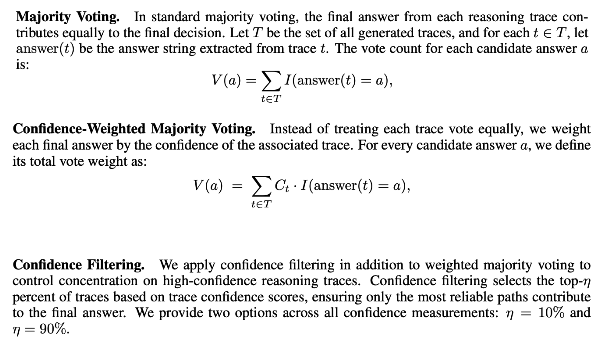 그리고 Confidence-Weighted Majority Voting는 이 문제를 해결하기 위해, 각 reasoning trace가 가진 confidence 값$C_t$ 을 가중치로 사용한다. 즉, 신뢰도가 높은 trace의 투표가 더 큰 영향력을 갖도록 설계한다. 여기서 $C_t$는 해당 reasoning trace t의 신뢰도 점수로, 앞서 제시된 여러 측정법(예: 평균 신뢰도, 그룹 신뢰도, 꼬리 신뢰도 등) 중 하나를 선택해 사용할 수 있다. 이 방식은 “모든 추론을 똑같이 취급”하지 않고, ‘자신 있는 reasoning’에 더 많은 표를 주는 투표라 할 수 있다. 그 결과, confidence가 낮은, 즉 불확실하거나 비논리적인 reasoning이 최종 결정에 미치는 영향을 크게 줄일 수 있다.