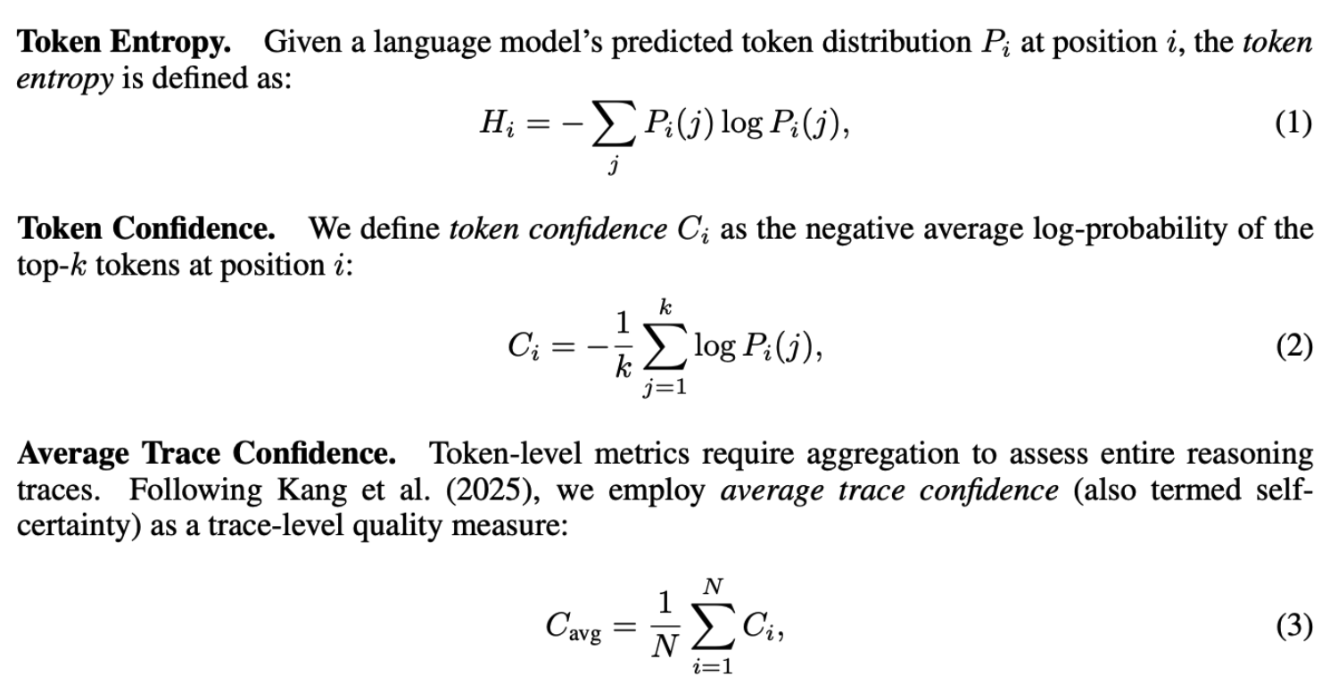 품질 지표로서 Confidence에 대해 살펴보자. 모델 내부에서 감지할 수 있는 Confidence 신호가 어떤 추론 경로가 품질이 높을 가능성이 있는지를 판별하는 데 유용하다는 것을 보여주는 부분이다. 먼저 Confidence metrics를 정의하고 그것들이 실제로 추론 경로의 정답 여부와 얼마나 상관관계가 있는지를 보여준다.