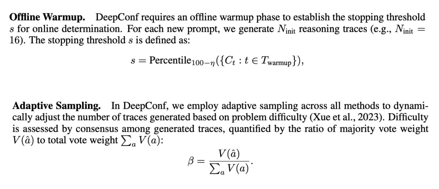 Adaptive sampling은 문제 난이도에 따라 생성할 추론 경로를 동적으로 조절하는 것이다. 문제의 난이도는 추론 경로의 합의 정도로 측정됨. 즉 여러 경로가 내논 답이 얼마나 일치하는 지를 본다. $\hat{a}$는 다수결로 얻어진 잠정적 정답, $V(a)$는 답변 a를 지지하는 총 conf 가중치, 미리 설정된 임계값 $\tau$(e.g. 0.95) 기준으로 임계값보다 베타가 작으면 아직 의견이 갈린다고 판단해 추론을 더 생성하고 크거나 같으면 충분히 일치하므로 멈춘다. 이 과정은 문제 난이도에 따라 추론 양을 자동으로 조절하게 한다.